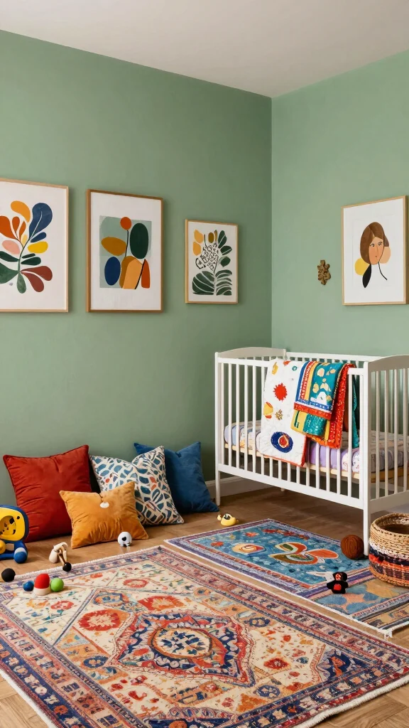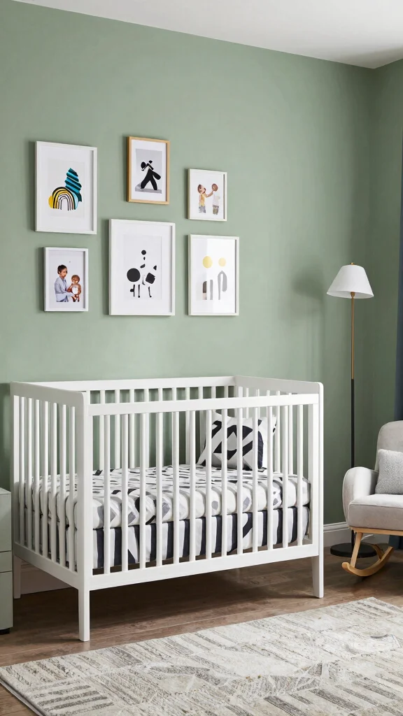 Ready to express your creativity in your nursery? An eclectic sage green nursery allows for a vibrant mix of styles and personal touches. Combine a sage green crib with colorful cushions and an array of artwork that ranges from abstract to classic. Layer rugs with different patterns to create visual interest and depth in the space. This design fosters self-expression and can easily evolve with your child, creating a rich environment that inspires creativity.
