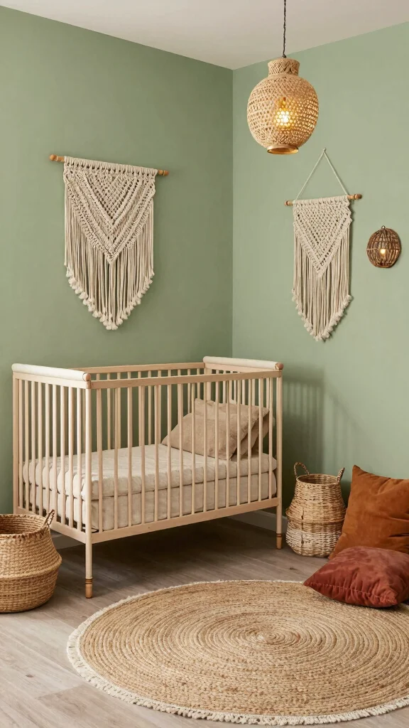 Do you adore a laid-back, bohemian aesthetic? A sage green nursery decorated in earthy tones and textures is the perfect choice. Woven baskets, macrame wall hangings, and layered rugs contribute to a cozy and inviting atmosphere. A sage green crib pairs beautifully with organic cotton bedding and boho textiles featuring muted patterns. Introduce plants to add a touch of nature and promote a serene ambiance. This style encourages a free-spirited vibe, perfect for nurturing creativity in your little one.