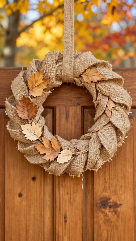 2) Burlap and leaf wreath: wrap burlap around the base, add greenery, finish with a ribbon.
