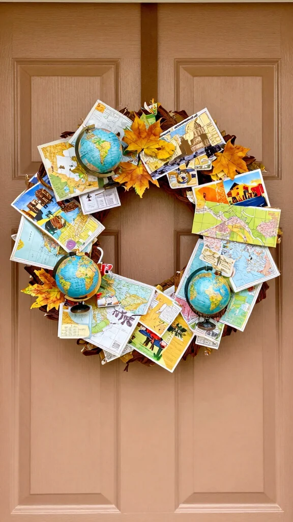 For the wanderlust in you, a travel-inspired wreath is a creative way to express your love for adventure. This fun project uses a wire frame to attach small travel mementos like postcards and maps, crafting a wreath that tells your unique story. This piece not only decorates your space but also sparks conversations about your travels.