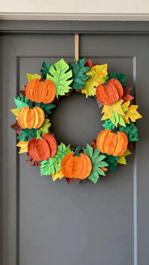 For sourcing materials, gather newspapers and glue for your paper mâché project. Using vibrant fall colors for your shapes will enhance the visual appeal, connecting your wreath with current trends that celebrate creativity and individuality in home decor.