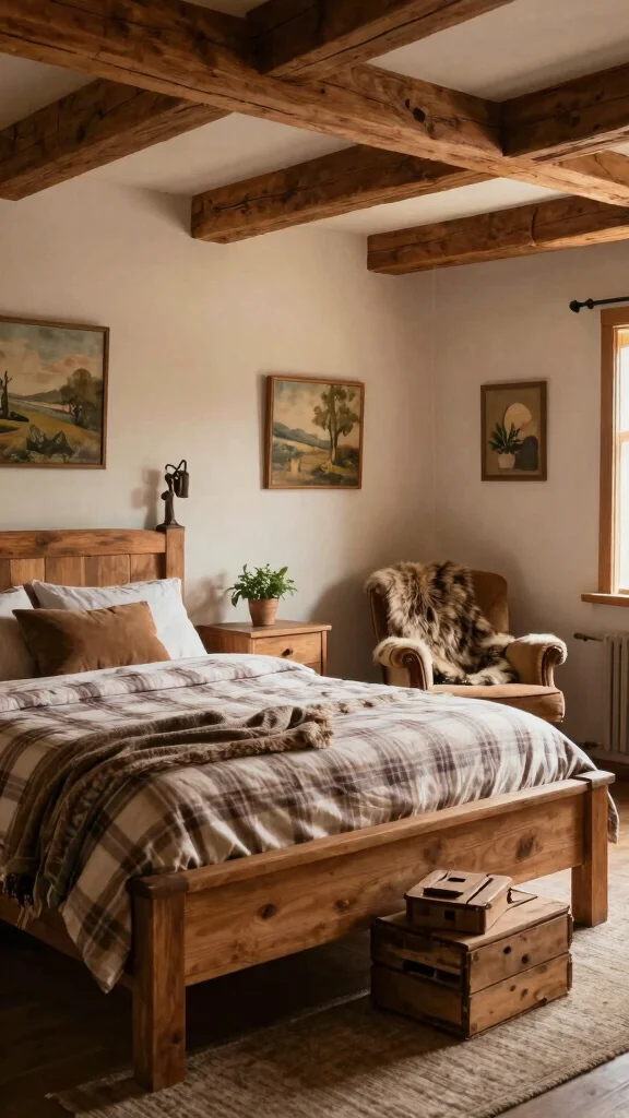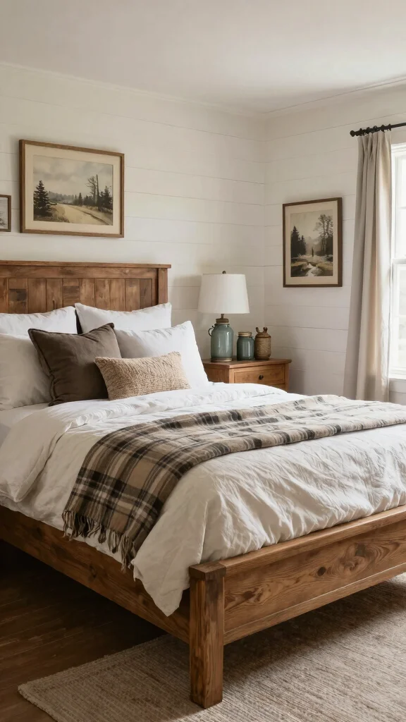 – Incorporate a farmhouse bedframe with plaid linens