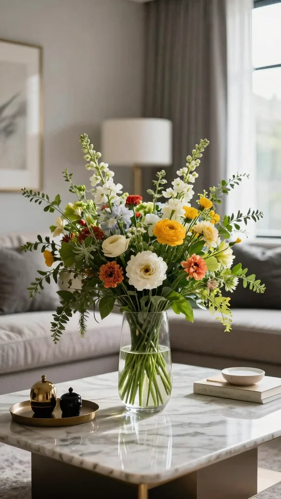 Looking to brighten your living room? Fresh flowers are unbeatable. Elegant vases filled with colorful blooms add a vibrant touch to your decor. Choose arrangements that harmonize with your color palette to maintain cohesion. Feel free to change flowers regularly to refresh your decor.