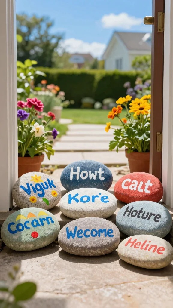 Create a warm welcome for guests with cheerful, colorful stones at your doorstep! Painting pebbles with friendly messages or vibrant patterns can transform your entrance into a delightful space. Choose welcoming phrases like ‘Welcome’ or ‘Home Sweet Home,’ or simply use bright colors that radiate joy. These stones can line your walkway or adorn your porch, giving a friendly touch that reflects your personality from the moment people arrive.