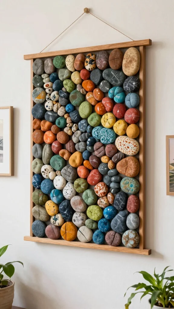 Transform pebbles into a stunning wall hanging that brightens any room! These decorative pieces can be designed in shapes like flowers, mandalas, or abstract forms. By attaching painted stones to a wooden frame or canvas, you create a unique art piece that adds character to your walls. This project allows for endless creativity, mixing colors, sizes, and designs to suit your decor style while recycling stones into art.