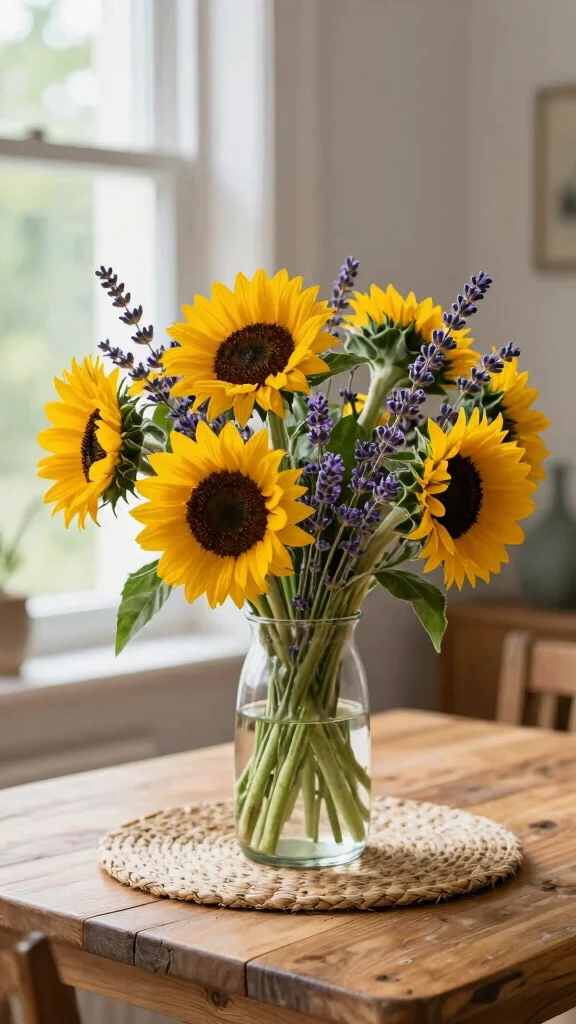 To create this stunning display, consider using rustic vases that complement the natural beauty of the flowers. Incorporate a mix of heights by layering sunflowers and scattering lavender sprigs around for fullness. Keep your arrangement fresh by changing the water regularly and trimming the stems at an angle.