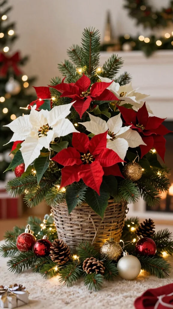 To create this cheerful display, use a decorative basket or festive container to enhance the cozy feel. Fill the base with pine cones or ornaments to elevate the holiday spirit. Keep your poinsettias out of direct sunlight and change the water regularly to maintain freshness.