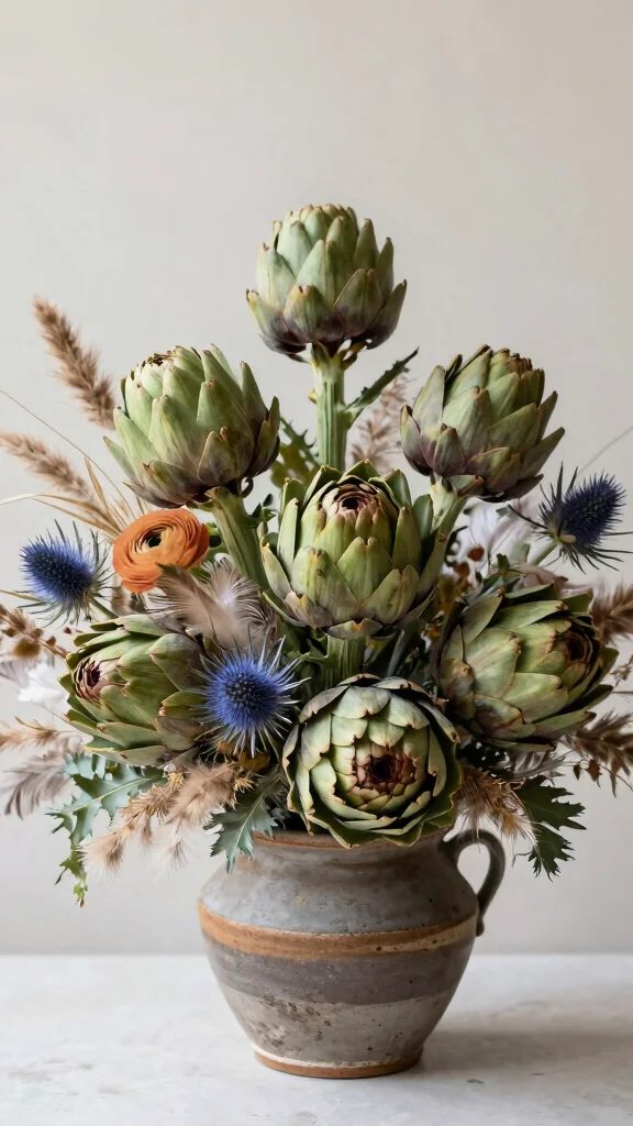 Create a captivating floral display by combining textured blooms like artichokes, thistles, and ranunculus. This unique mix offers an intriguing feast for the eyes, perfect for creative spaces or eclectic decor styles. Mixing different textures not only enhances visual appeal but also adds depth and intrigue to your arrangement.