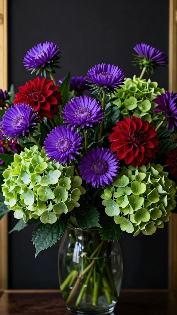 For a striking visual impact, choose jewel-toned flowers such as deep purple asters, emerald green hydrangeas, and ruby red dahlias. This bold combination adds richness and elegance to any room, making it perfect for formal settings or to introduce a touch of drama. Jewel tones evoke a sense of luxury, transforming your decor into a statement piece.