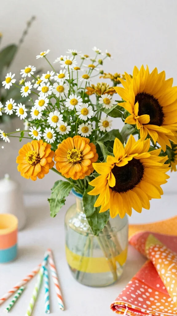 To enhance this cheerful display, use a bright, colorful vase that complements the fun atmosphere. Keep the arrangement loose and casual, allowing the flowers to fall naturally for an effortless look. Remember to keep them in a cool spot with regularly changed water to maintain their freshness.