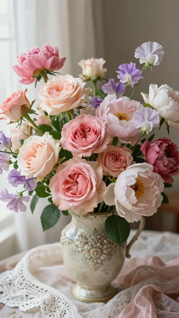 To enhance the beauty of this arrangement, use a vintage vase that complements the delicate colors. Arrange the flowers loosely to maintain a natural feel, allowing each bloom to shine. Keep the arrangement in a cool, shaded area to prolong their beauty.
