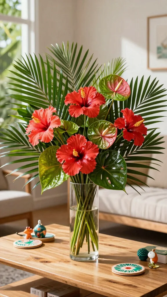 To bring this tropical vibe to life, use a clear glass vase that showcases the beautiful colors within. Group the flowers in clusters for a fuller appearance, and consider a tall vase to add drama to your display. Regularly change the water and trim the stems to keep your arrangement vibrant and fresh.