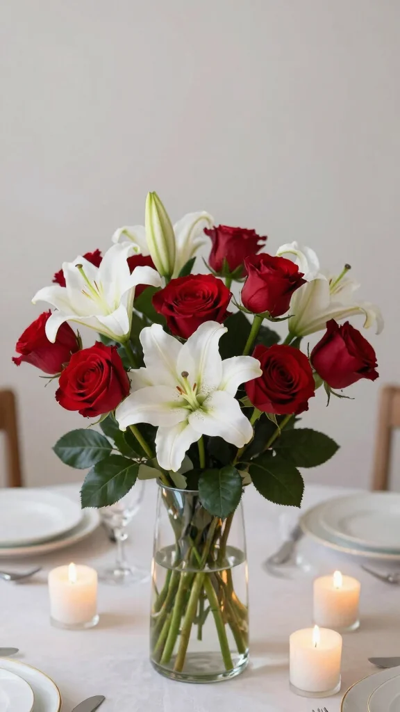 For a truly romantic touch, create a stunning arrangement of red roses and white lilies. This classic combination embodies love and elegance, making it perfect for special occasions or intimate dinners. The passionate red of roses paired with the pristine white of lilies forms a striking visual that captures attention and evokes deep emotions.