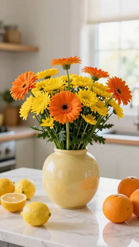 Infuse your home with joy using a vibrant mix of citrus-hued flowers such as orange gerbera daisies and yellow chrysanthemums. This lively combination brings warmth and cheer to any space, making it perfect for kitchens and dining areas where happiness thrives. The bright tones create an uplifting atmosphere that inspires positivity.