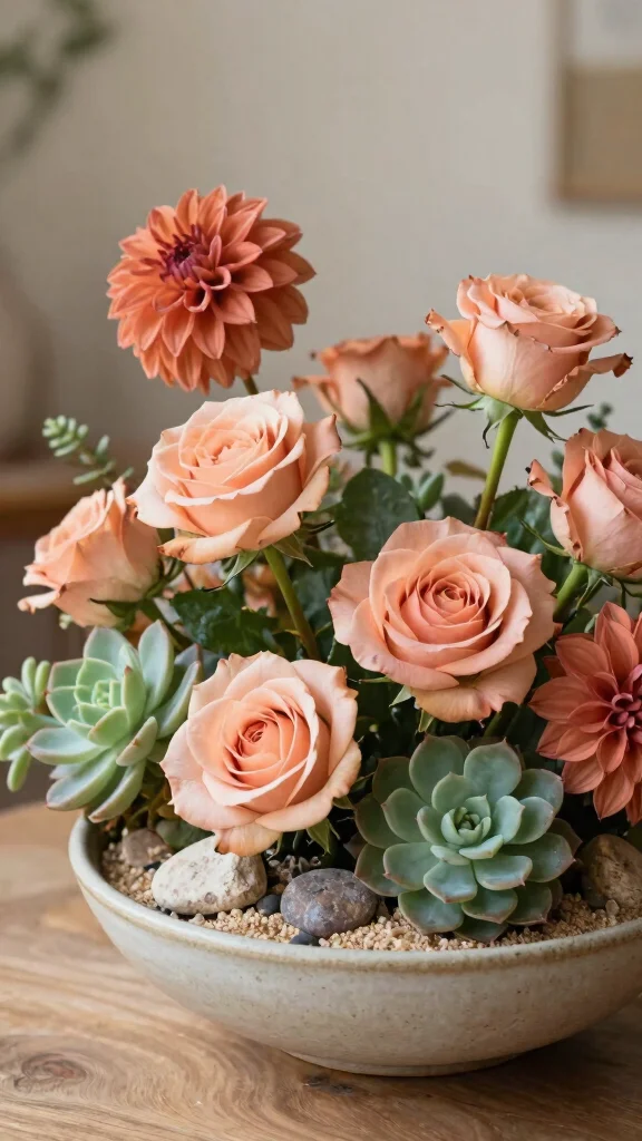 Create a grounded yet chic floral arrangement by combining succulents with earthy-toned flowers like peach roses and terracotta dahlias. This look is perfect for those who appreciate a natural aesthetic. The blend of succulents and soft-colored flowers fosters a harmonious balance, bringing tranquility into your home.