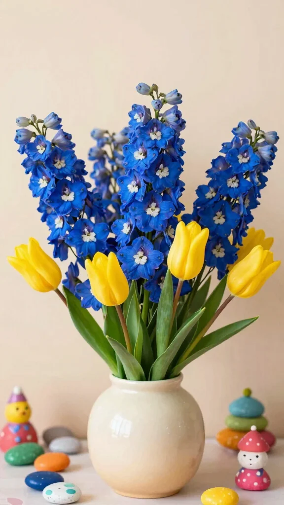For a vibrant burst of energy, create an arrangement featuring royal blue delphiniums and bright yellow tulips. This dynamic combination is perfect for those who love a bold color palette. The stunning contrast between blue and yellow invigorates any room, making it ideal for cheerful spaces like playrooms or casual living areas.