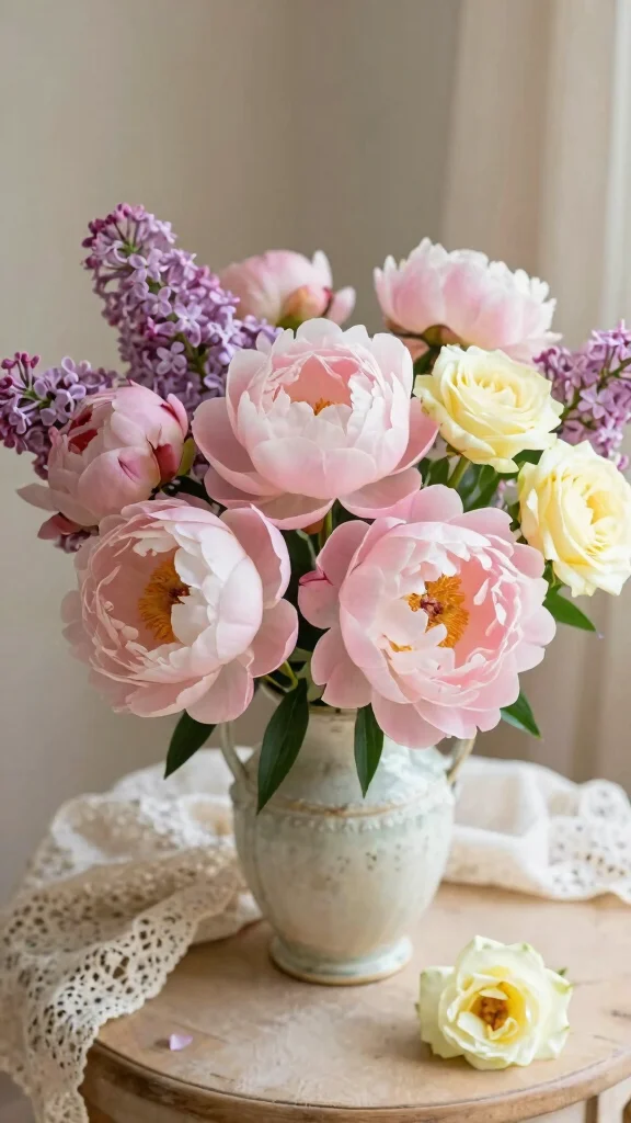 Create a serene atmosphere with a gentle combination of pastel flowers such as light pink peonies, soft lilacs, and pale yellow roses. This romantic arrangement adds a subtle touch of charm to your decor, making it perfect for bedrooms or quiet sitting areas. Soft pastels evoke calmness, creating a tranquil vibe throughout your space.