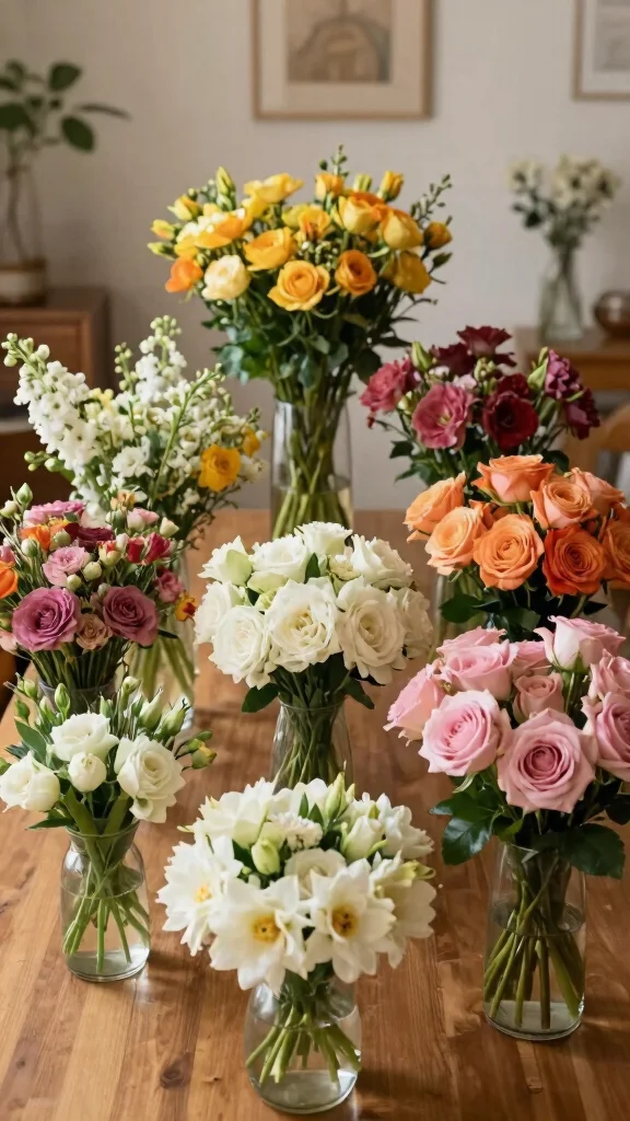To enhance this garden feel, select sturdy, vibrant blooms with a sweet fragrance. Use a vintage-style vase to showcase your arrangement, placing the flowers tightly for a lush appearance. Keep them in fresh water and ensure they receive indirect light for longevity.
