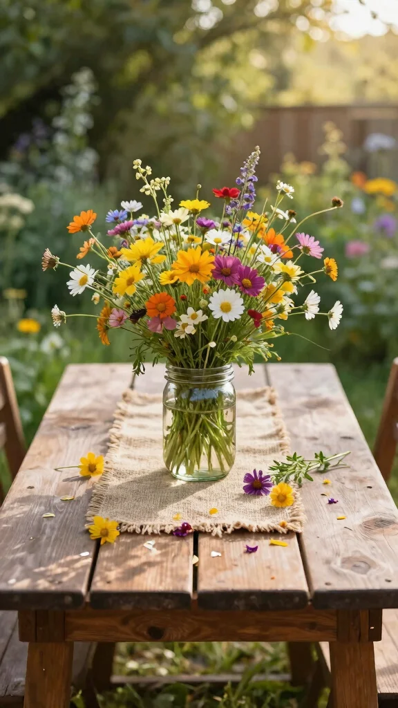 To bring this look to life, consider sourcing wildflowers from your own garden or a local farmer’s market. Mixing different heights and textures will add depth and interest, while wrapping the jar with natural twine enhances the rustic charm.
