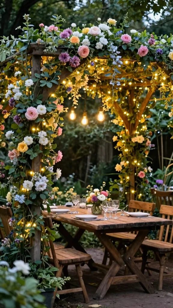 To achieve this design, utilize a trellis structure for the flowers to climb against, adding visual drama. Twinkling lights along the trellis enhance the enchanting feel, while pairing it with rustic wooden furniture adds a natural touch.