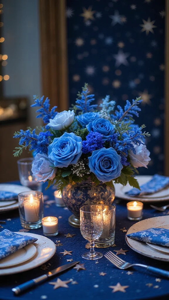 Capture the essence of the night with a moonlight-inspired floral arrangement. Using deep blues, purples, and silvers reflects the night sky beautifully. Incorporating elements like star accents or silver vases enhances the cosmic feel, making this centerpiece perfect for evening gatherings or themed parties.