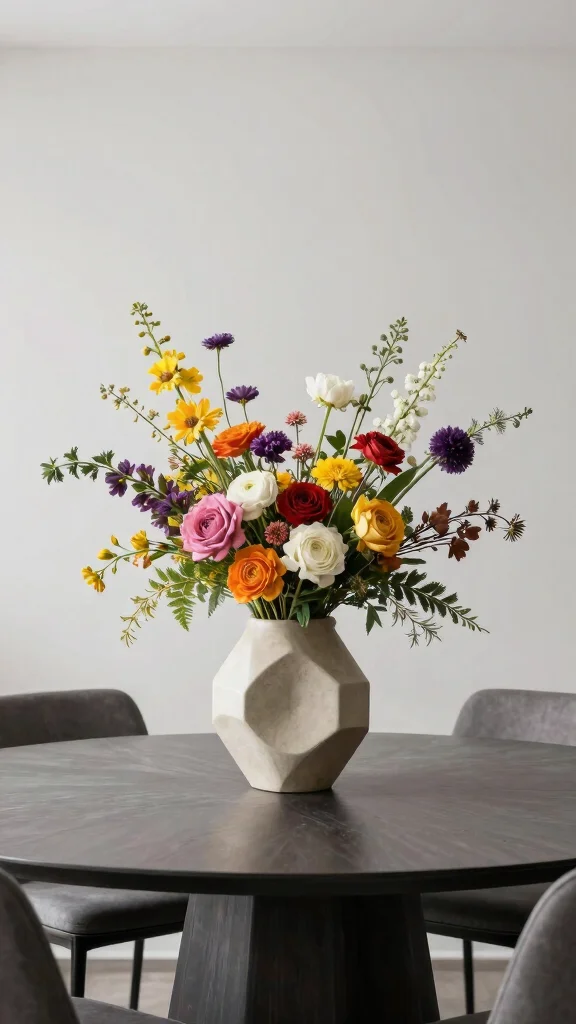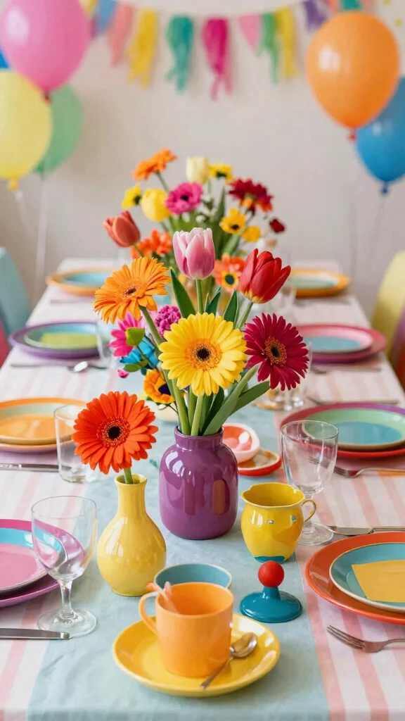 Bring a playful spirit to your gatherings with a colorful carnival-inspired floral arrangement. Using an array of bold, bright flowers like gerbera daisies, tulips, and marigolds in funky containers creates a lively centerpiece ideal for birthday parties or family get-togethers, spreading an infectious sense of joy.