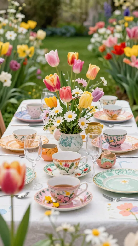 End your floral journey with a whimsical garden tea party setting that combines vibrant flowers with playful decor. Using bright tulips, playful daisies, and colorful foliage creates a cheerful centerpiece perfect for casual afternoon gatherings, inviting joy and relaxation.