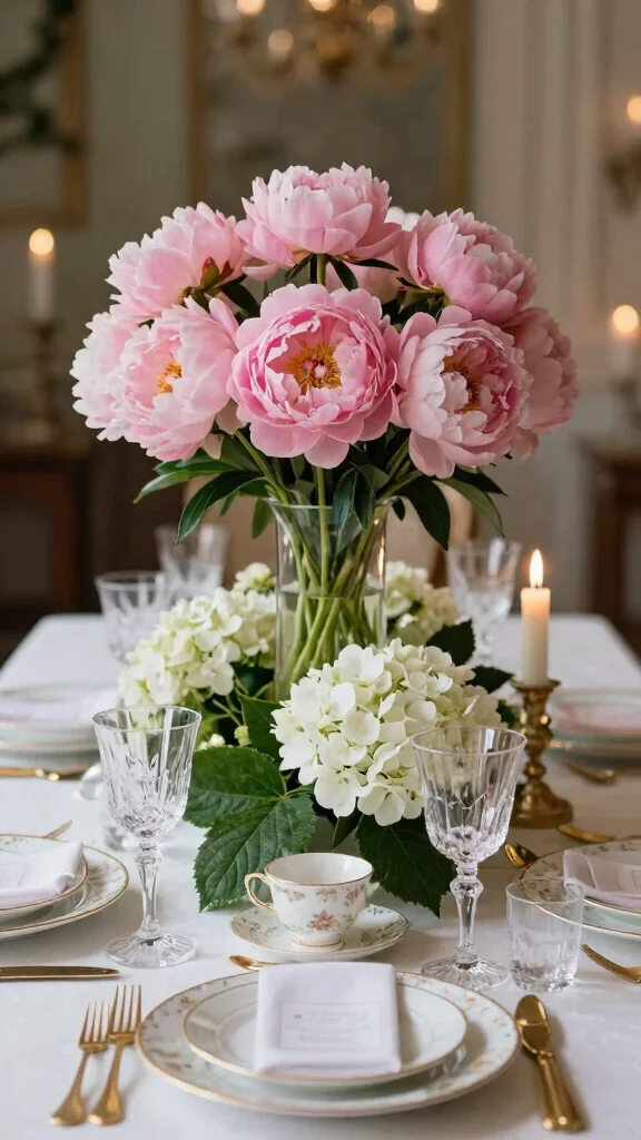 Peonies offer lush blooms and soft colors, exuding elegance that’s perfect for special occasions. Arranging these beauties in a tall glass vase filled with water highlights their natural beauty. Pairing peonies with white hydrangeas or green foliage creates a chic contrast that elevates the overall look, making it perfect for bridal showers or formal dinners.
