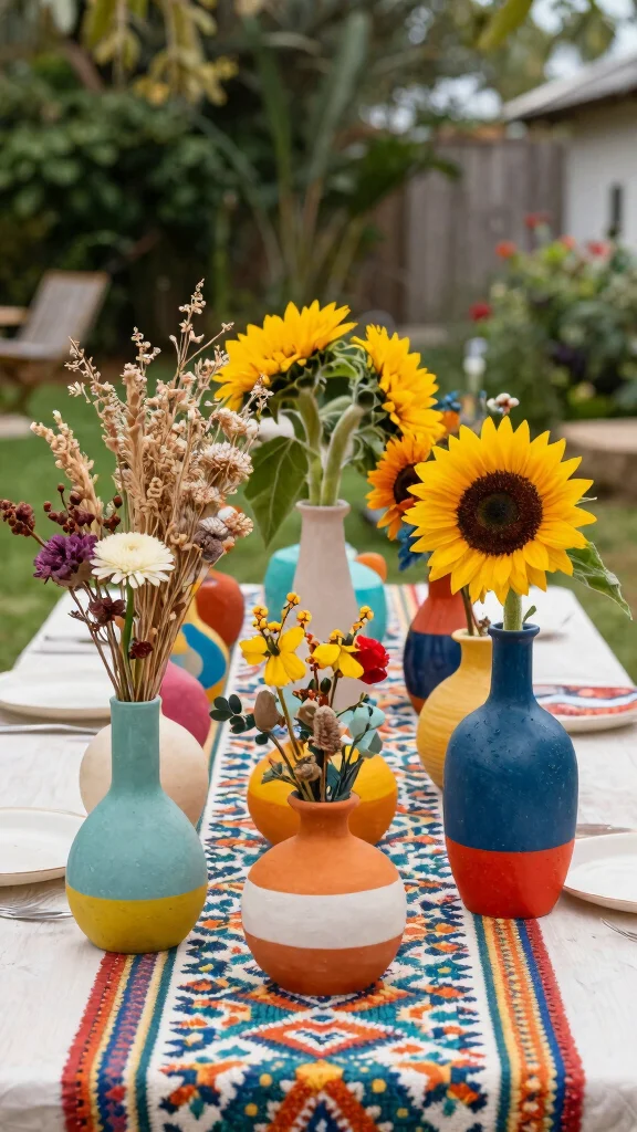 Embrace the free-spirited boho vibe with whimsical floral arrangements that celebrate diversity. An eclectic mix of sunflowers, zinnias, and dried blooms arranged in mismatched vases or terracotta pots captures the charm of this laid-back style, making it ideal for casual gatherings or festival-themed parties.