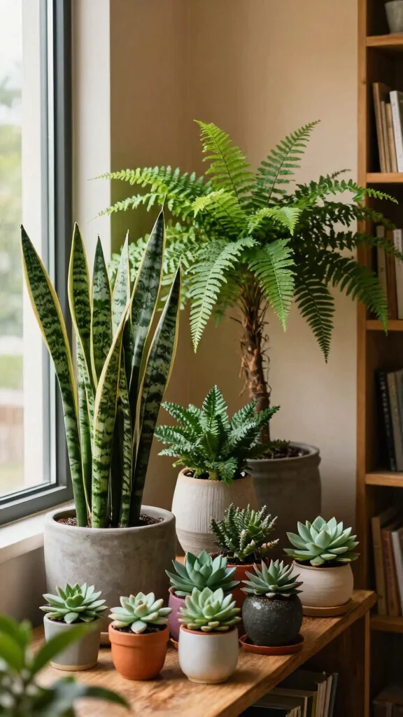 – Pair ferns in ceramic pots with vibrant succulents.
