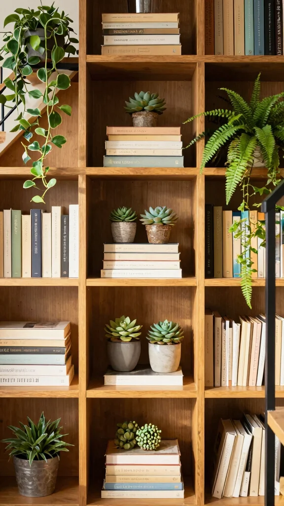 – Add small plants to bookshelves.