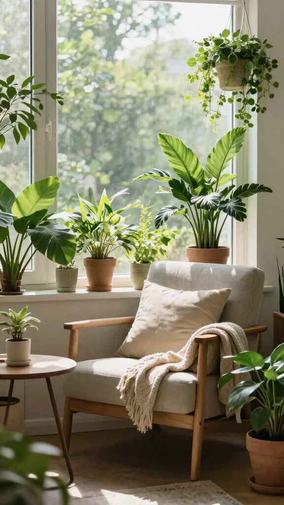 Create a cozy reading nook or sitting area that’s infused with greenery! Incorporate plants by placing them on tables or using a small bookshelf to display them alongside your favorite books. This can transform an ordinary space into a serene oasis perfect for relaxation.