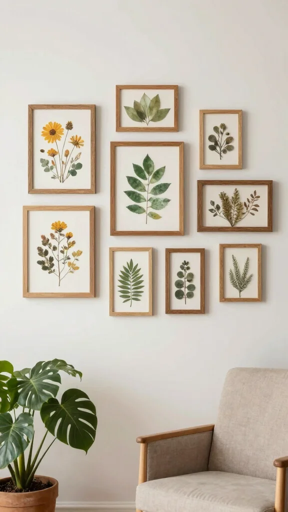 To create a captivating display, mix framed art with 3D elements, such as shadow boxes filled with dried flowers. Consider designing a gallery wall that combines various frame sizes, and choose natural wood frames to enhance the organic theme of your decor.