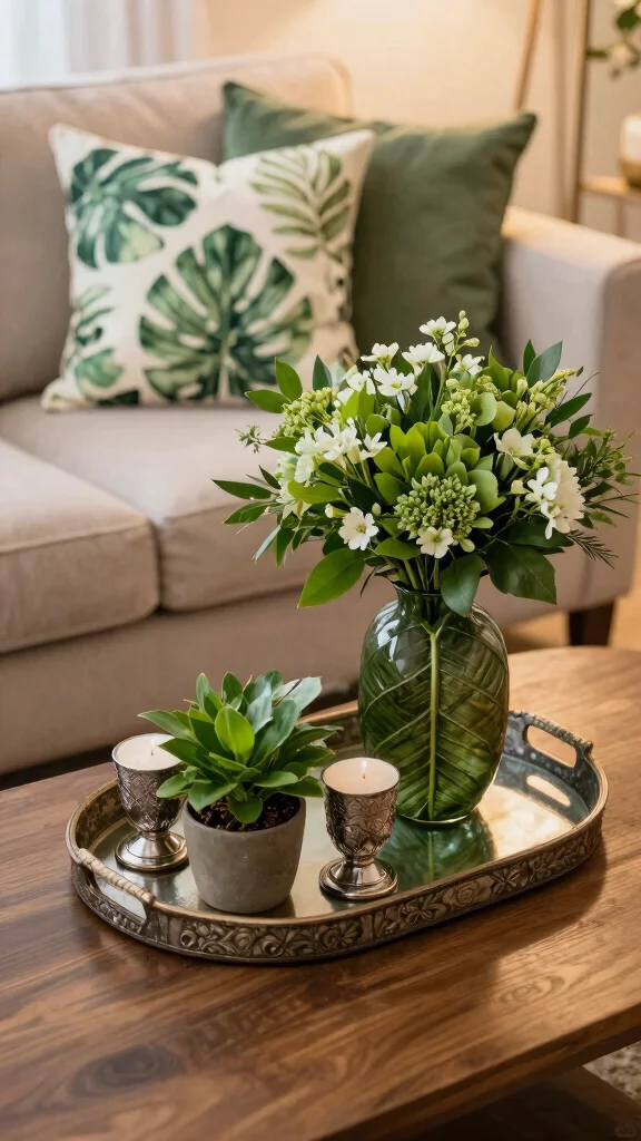 To enhance your decor, select trays with botanical prints to display candles or small plants, and choose vases shaped like leaves to hold fresh flowers. Incorporating throw pillows with leafy patterns on your sofa can also tie the greenery theme together.