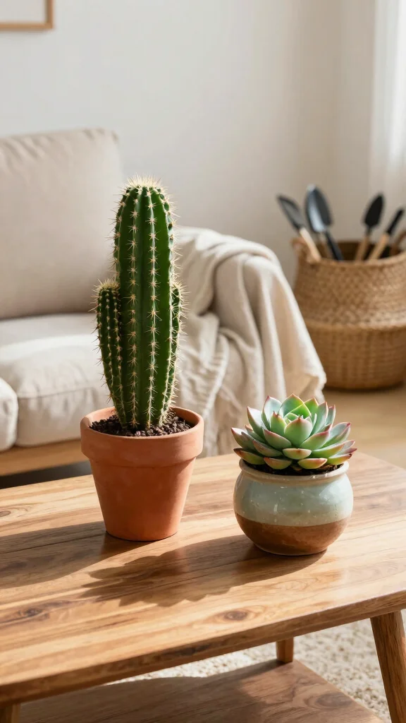 To make the most of this pairing, consider using decorative pots that complement your home’s aesthetic. A rustic terracotta pot for the cactus and a colorful ceramic pot for the succulent can create a striking display.