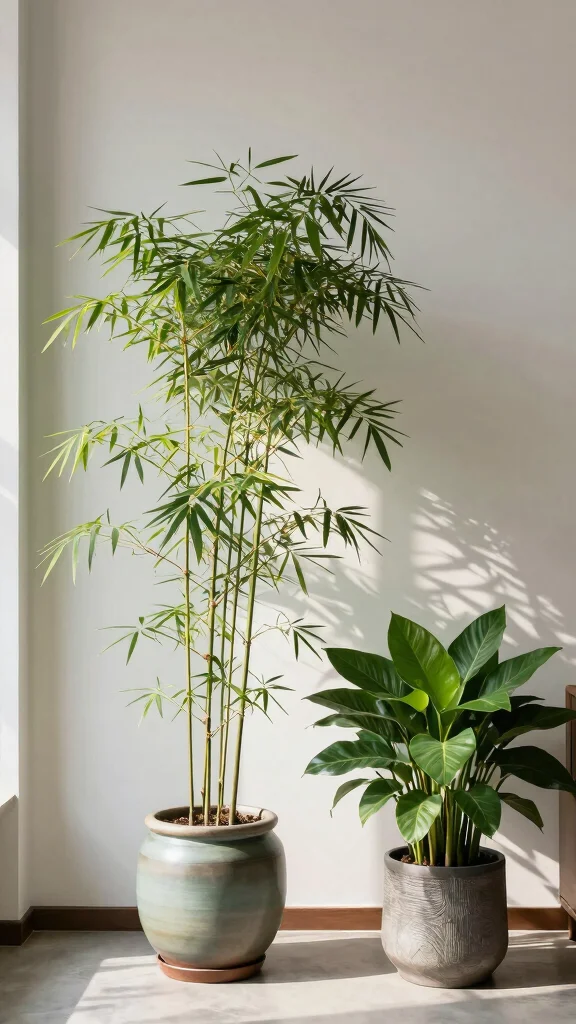 To highlight their differences, use a tall ceramic pot for the bamboo and a shorter, textured pot for the Chinese evergreen. Placing them near a window enhances their natural colors and vitality.