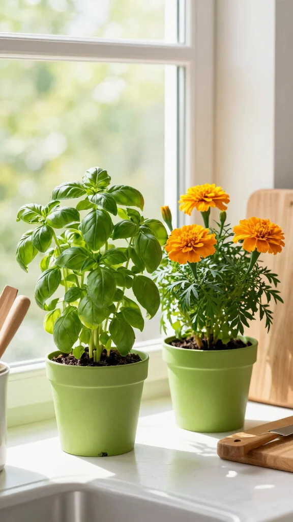 The combination of sweet basil with marigolds not only creates a beautiful display but also attracts beneficial pollinators to your home. The bright yellows and oranges of marigolds contrast beautifully with the lush green of basil, bringing color and life to any space. This pairing is perfect for a lively herb garden.