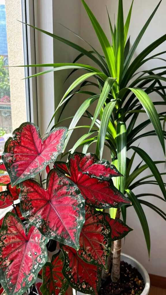 12. Bold Red-Leafed Caladium and Dracaena Pair