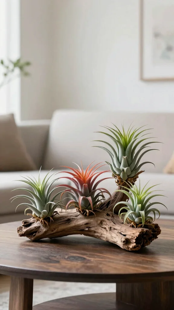 Air plants displayed on driftwood create an artistic centerpiece that is both modern and eco-friendly. The sculptural quality of air plants, paired with the natural texture of driftwood, elevates your decor dramatically. This combination suits various styles, from rustic to contemporary, making it a versatile choice.