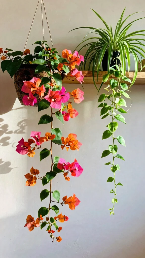 To create a dynamic display, use a hanging basket for the bougainvillea while placing the spider plant on a shelf for added height. This contrast enhances the visual appeal.