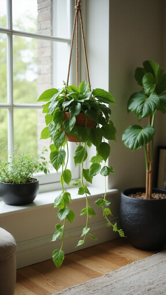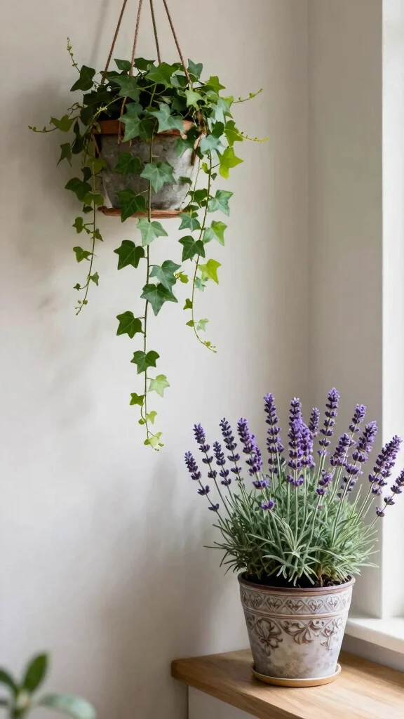 Consider displaying ivy in hanging pots on a wall shelf, while placing lavender in a decorative pot on a table. This arrangement balances elegance and practicality.