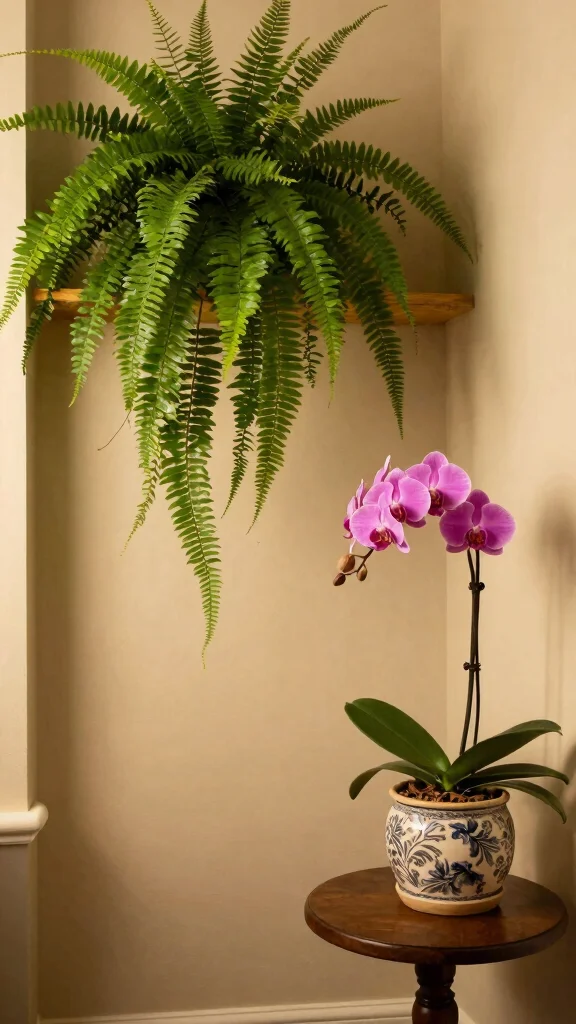 For a stunning display, choose a hanging fern to cascade gracefully from a shelf, paired with a vibrant orchid in bloom. This combination not only looks beautiful but also brings a breath of fresh air indoors.