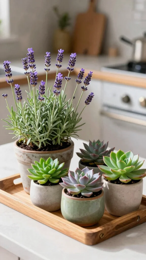 The calming scent of lavender combined with the playful shapes of succulents creates a delightful garden feel. Position a trio of small, unique succulents alongside a larger lavender plant to form an attractive focal point. This combination thrives in sunny spots, making it perfect for windowsills or kitchen counters.