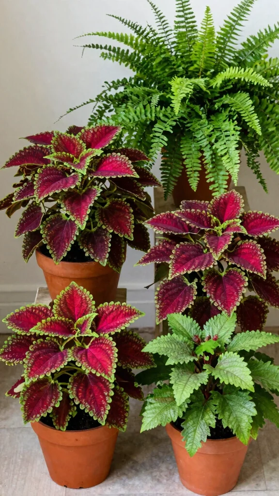 For depth, position a large fern as a backdrop, placing smaller coleus pots in the foreground. Mixing different varieties of coleus can enhance the visual interest with diverse colors and leaf shapes.