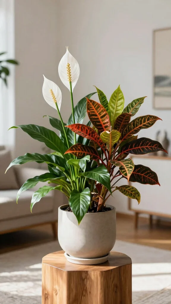 The elegant Peace Lily combined with the vibrant colors of Croton creates a stunning focal point in any space. The contrast between the Peace Lily’s pristine white blooms and the fiery foliage of Croton adds a dynamic element, bringing energy to the room. This duo not only enhances the decor but also cleans the air, boosting your indoor environment.