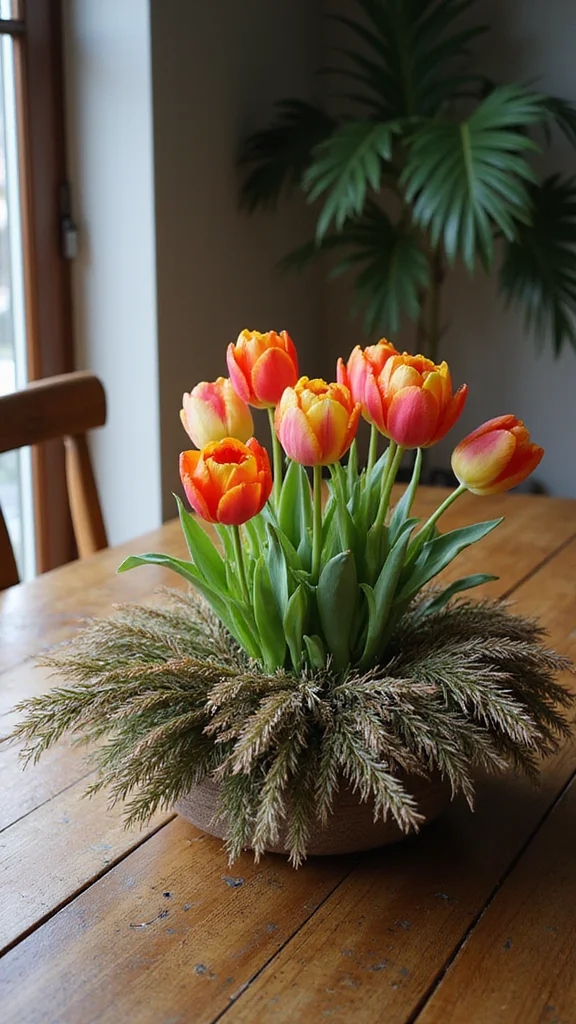 To create a stunning visual, use tulips or daffodils as a centerpiece, surrounded by soft, wispy grasses. This contrast not only enhances the beauty but also adds flair to your decor.