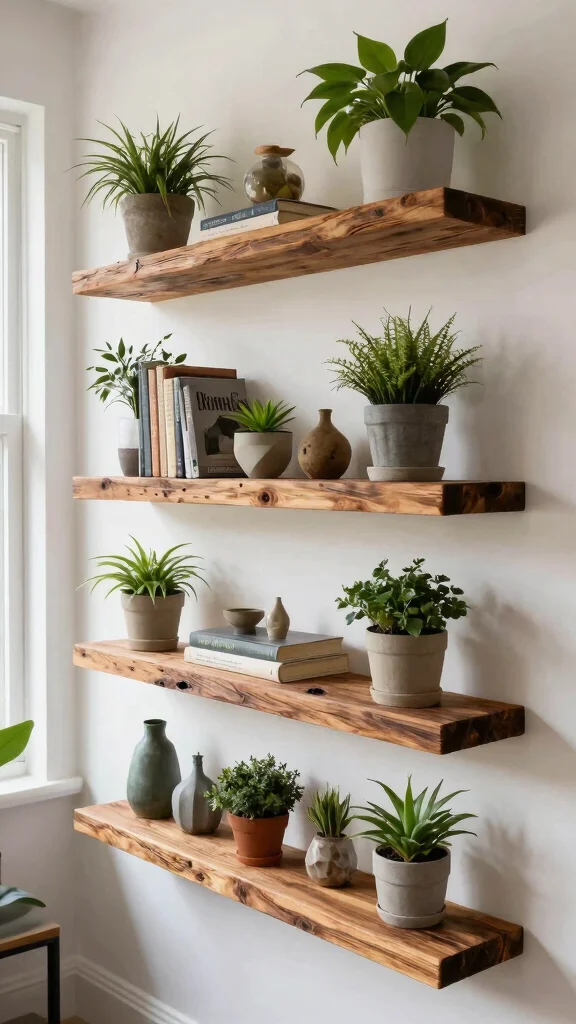 Source reclaimed wood from local shops or old furniture, and sand it down to reveal its natural beauty. Use brackets or rope for hanging, allowing you to create a unique display that enhances your decor. These shelves are not only functional but also a statement of eco-conscious design.