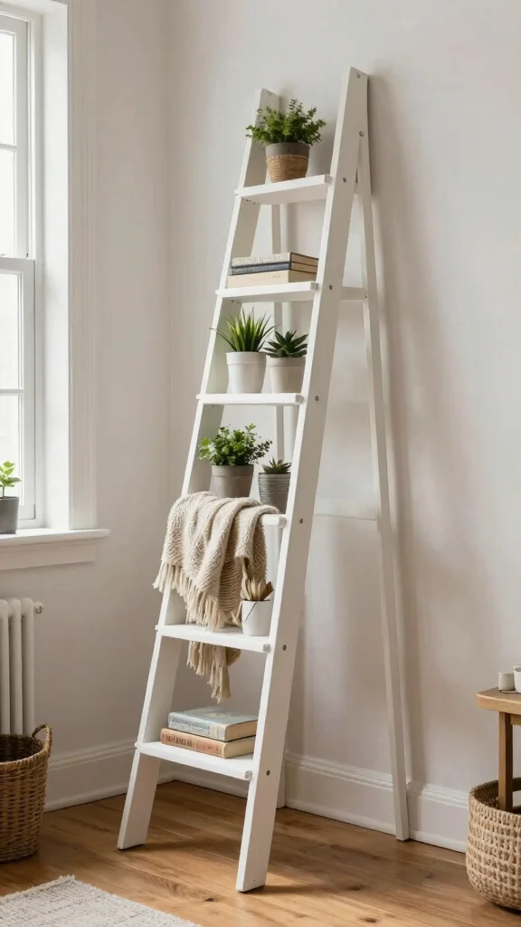 Introduce vertical interest to your space with a decorative ladder display that serves both style and functionality. Ladders can be repurposed to showcase decorative items, bringing a casual charm to any room. Imagine a beautifully styled ladder leaning against the wall, adorned with plants, books, or cozy blankets.