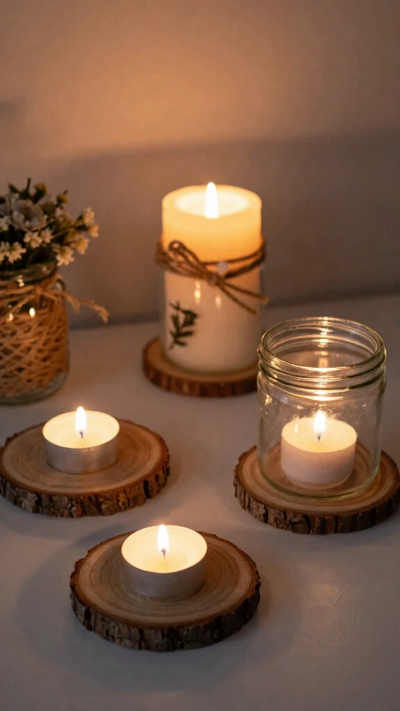 Gather materials like glass jars, wood slices, or clay to start your project. For wood slice holders, drill a hole for a tealight, or decorate glass jars with paint or twine for a personalized touch. These candle holders provide a cozy ambiance, perfect for enhancing your living or dining areas.