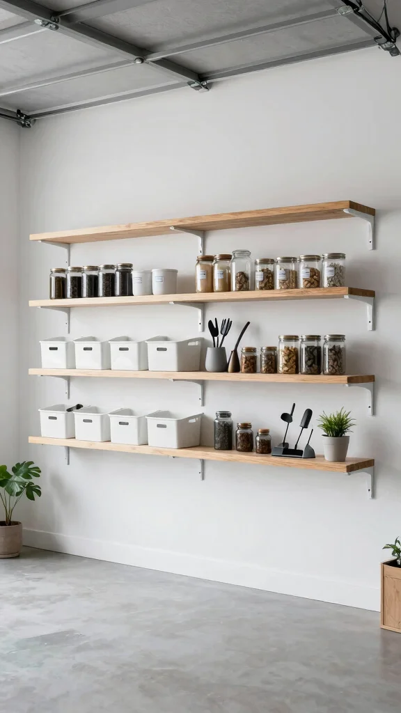 Wall-mounted shelves enhance both functionality and aesthetics, turning your garage into an organized haven.